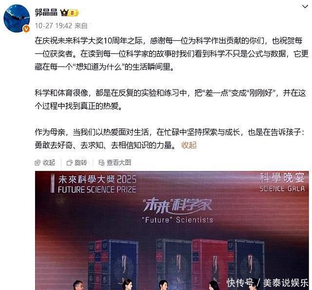31岁章泽天和44岁郭晶晶同台,女人到中年,日子都写在脸上了最近在香港举办的未来科学大奖活动上,章泽天和郭晶晶罕见同台,吸引了一大波人的注意。这场盛会本来是科学家们的主场,没想到两个家喻户晓的“豪门太太”同框,立刻成了网络热门话题。